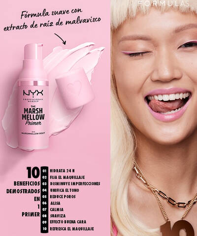 ¡Descubre el efecto Marshmellow! Esta extraordinaria prebase 10 en 1 está enriquecida con un extracto suavizante de raíz de malvavisco que da lugar a 10 beneficios increíbles para prolongar la duración del maquillaje.